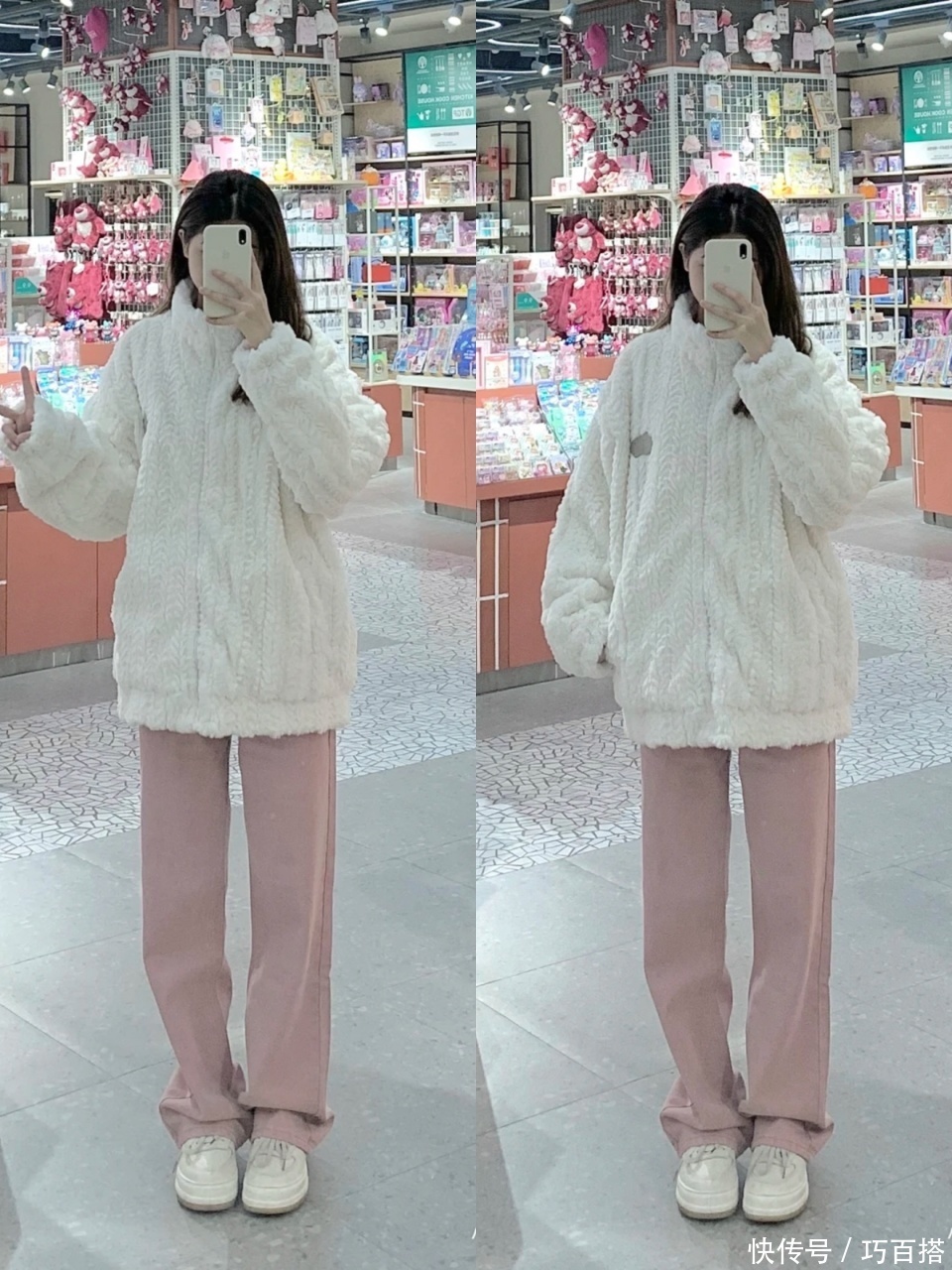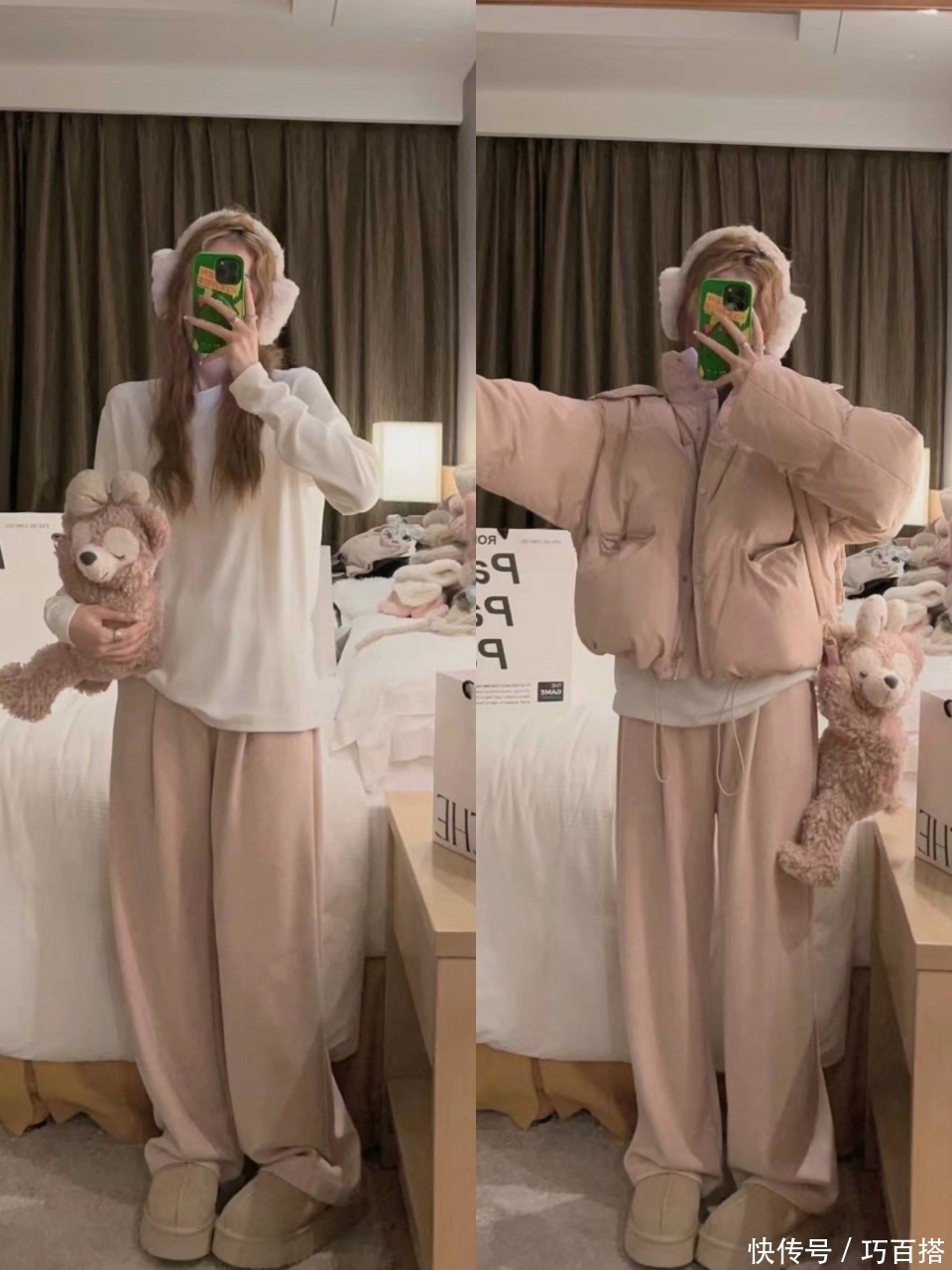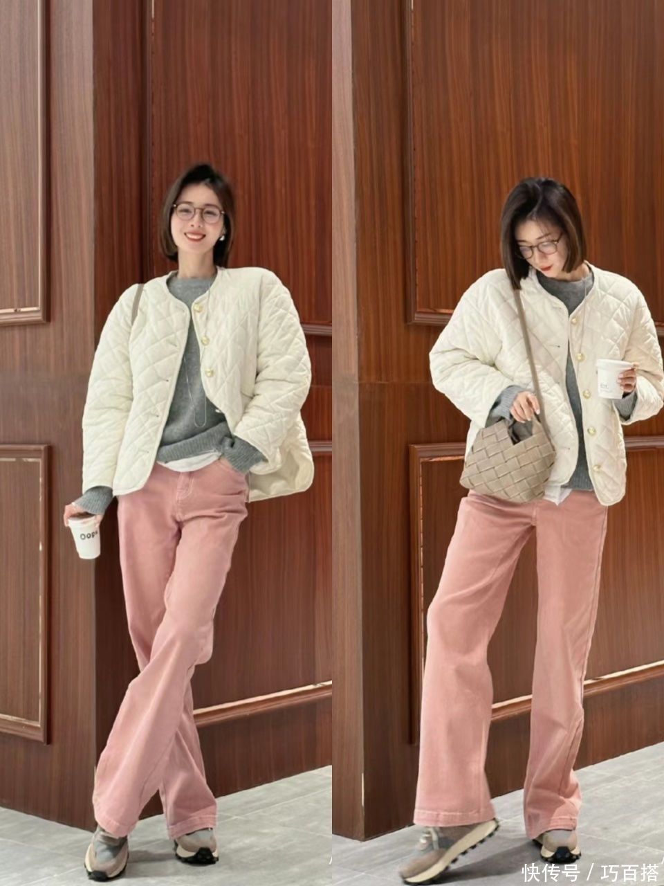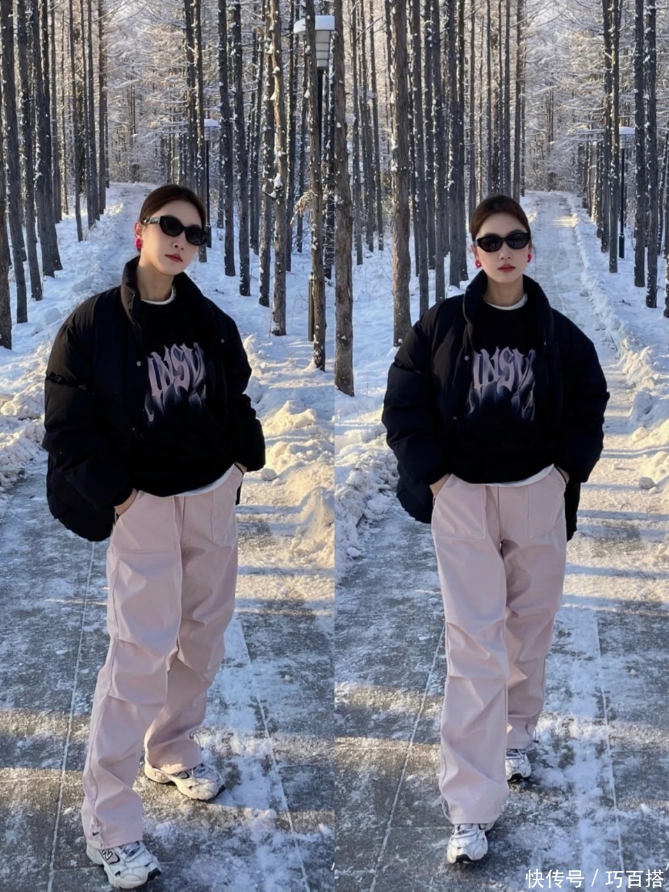 冬天选拔粉色长裤+白色羽绒服,簇新甜好意思又御寒,澄澈干净的配色不仅不错在稠密东谈主中脱颖而出,而况还能和周围环境酿成蛮横呼应,若是近期你的城市正不才雪,外出班师码住这套造型,冒昧削弱赚足回头率,穿衣小白也能猖狂独霸。