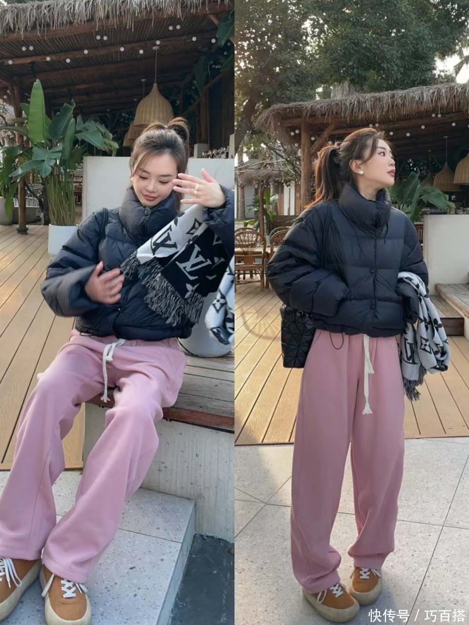 和博主相似,选拔玄色羽绒服搭配粉色长裤时,不错应用上短下长的版型永别体格比例,体格五五分的小个子女生一定要get,天然不可让你立马变苗条,但最起码看上去不会“虎背熊腰”。