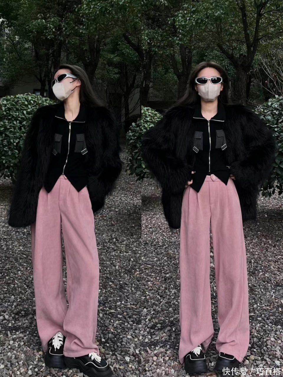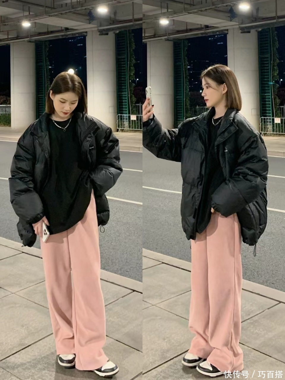 宽松肥硕的玄色毛衣和羽绒服遮肉显瘦有型又有范,搭配粉色拖地阔腿裤,慵懒又适意,讲究我方肤色不相宜粉色单品的姐妹,也不错宽解选拔,远隔脸蛋的粉色系,完全莫得肤色为止。