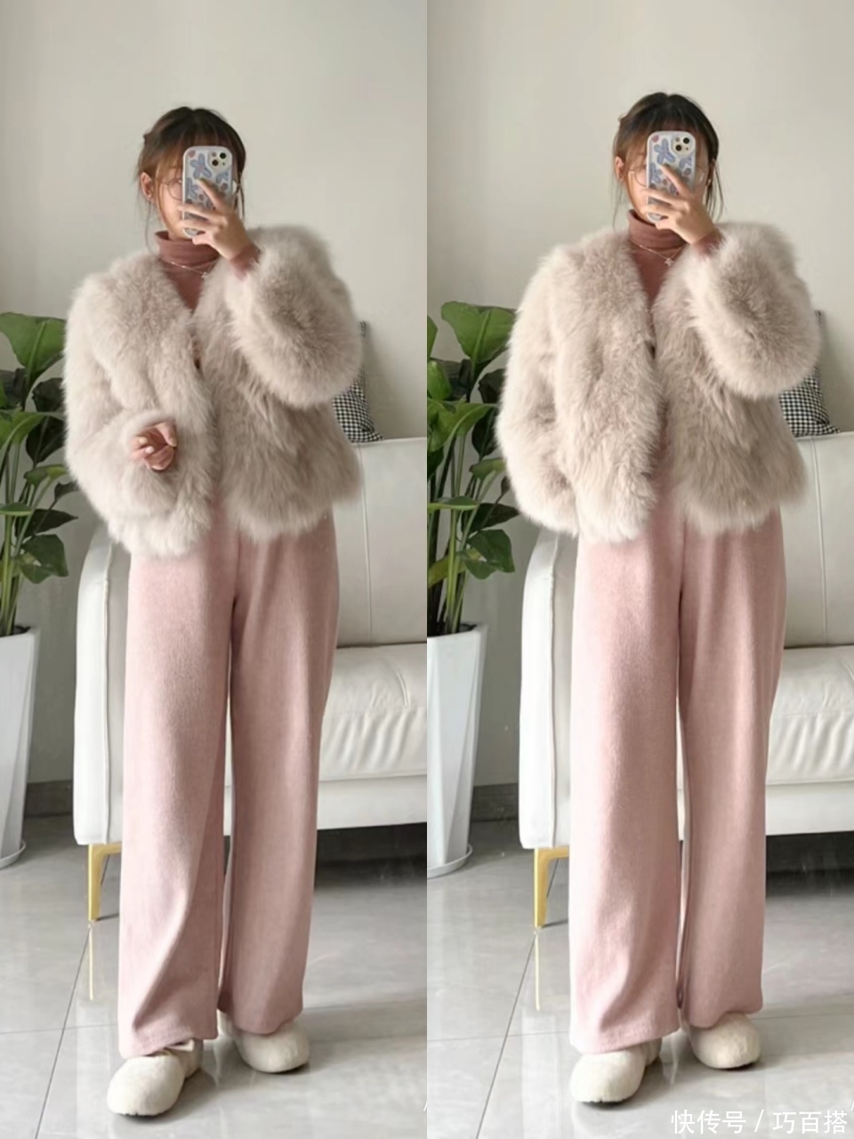 粉色长裤除了不错和玄色羽绒服搭配外,还不错和玄色皮草搭配,毛绒质感温煦又善良,聚积凉爽极简的纯玄色,不忙绿就能赚足回头率。