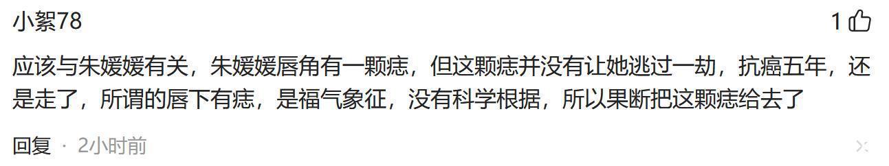 还有网友猜度可能与朱媛媛相接头,因为朱媛媛的唇角也有一颗痣,但是这颗痣并莫得给她带来好运谈,年龄轻轻的就走了,无意孙俪也有由此感悟到了什么,是以就去把这颗痣切掉了。